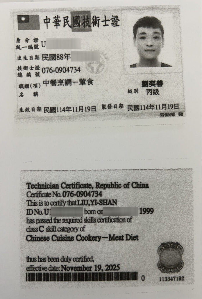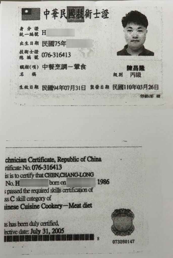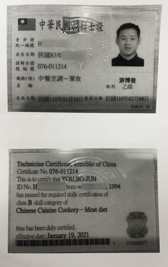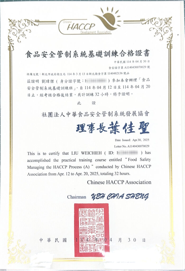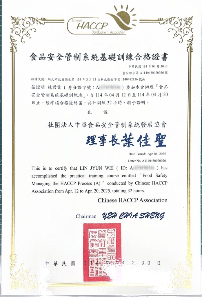皇膳擁有HACCP食品安全管制系統基礎訓練班合格、中餐烹調丙級和乙級等證照,